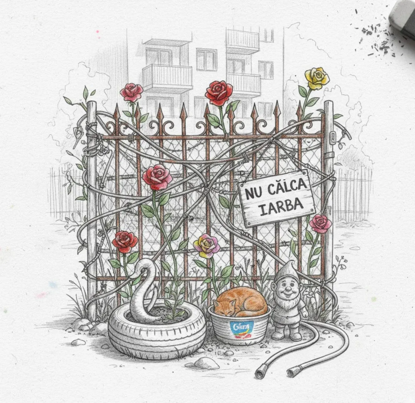 Dincolo de sârmă și lalele sintetice, grădină este o frontieră psihologică. O plăcuță scrisă cu marker permanent pe un fund de ladă de plastic — laminată cu scotch pentru un plus de profesionalism — avertizează: „NU CĂLCA IARBA”.