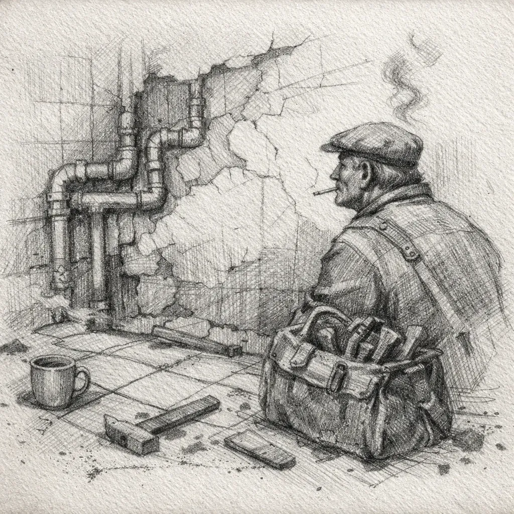 Am privit peretele împreună. Gletul era pus strâmb, cu o nesiguranță care arăta lipsa de meșteșug. Un om cu prea multă imaginație l-ar fi numit artă abstractă. Meșterul l-a numit mizerie. El credea în unghiuri drepte, in linii care nu mint și in lucruri care rămân acolo unde le pui până când lumea se sfârșește. Celălalt, cel care plecase, crezuse probabil în noroc. Dar norocul este o monedă slabă; nu ține țevile strânse când vine presiunea apei.