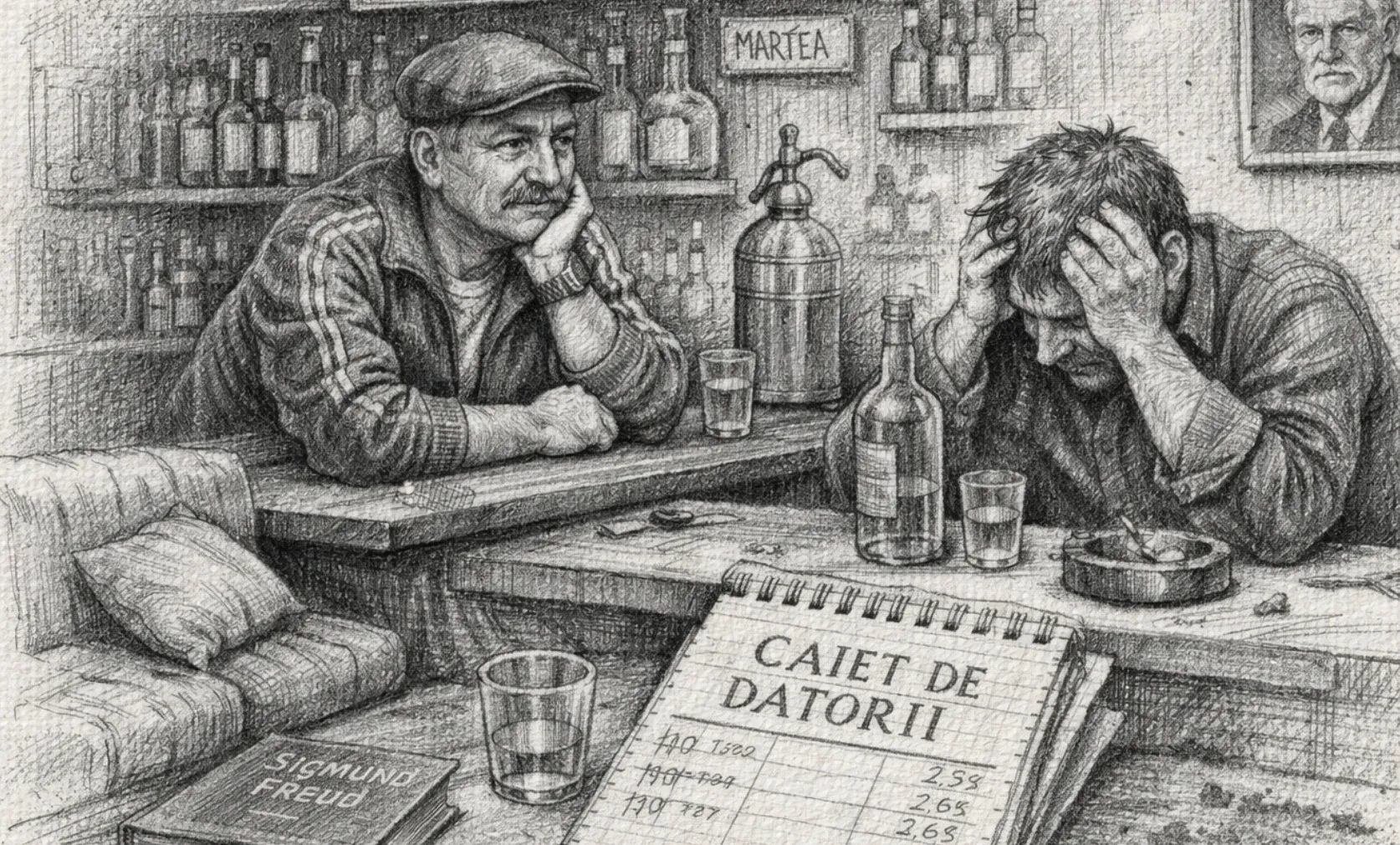Undeva în zona Cotroceni, un specialist cu ochelari rotunzi ascultă tăcerea unui client care plătește 400 de lei pe oră pentru a se întinde pe un divan de piele. Dar adevărata chirurgie a sufletului românesc nu are loc acolo. Ea se întâmplă la trei străzi distanță, într-o bodegă unde mirosul de detergent ieftin se bate cu aroma de mici reîncălziți.