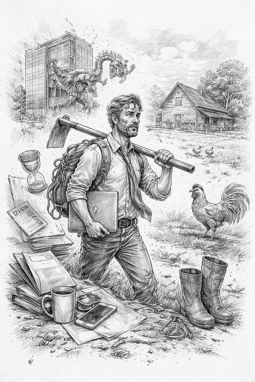 Seara, când lumina apune peste dealuri, iar libertatea pare aproape atinsă, un „vultur” electronic aduce un email cu subiectul: „Mică ajustare la deliverables”. Ființa rurală contemplativă dispare instantaneu; apare profesionistul responsabil, prizonierul propriului simț al datoriei. Libertatea este un concept divin, dar compatibil doar cu fluxurile de lucru aprobate de zeii de la sediul central.