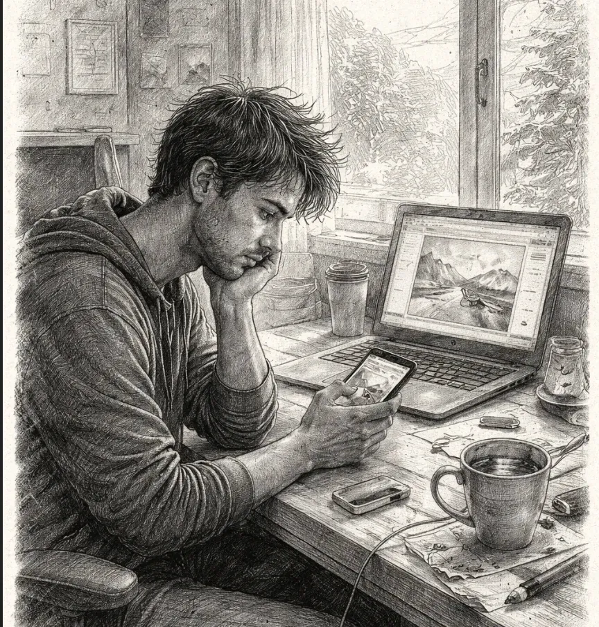 Pe ecranul telefonului, vacanța lui arată splendid. Există o fotografie cu o ceașcă de cafea aburindă în fața unei ferestre spre crestele înzăpezite. Sub ea, treizeci de oameni — unii pe care nu i-a văzut de zece ani, alții pe care nu-i va vedea niciodată — au lăsat simboluri de inimi roșii. „Ce binecuvântare!”, a scris cineva. „Ești un răsfățat al sorții”, a adăugat altul, un fost coleg care probabil îi monitorizează eșecurile cu o speranță tăcută.